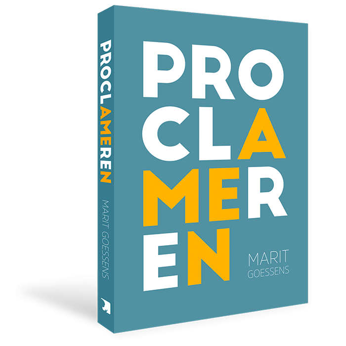 Proclameren is een bijzonder boek. Een uitnodigend doe- en studieboek voor tieners en volwassenen en voor wie bidt. Gods woord hardop uitspreken en de kracht die daar van uit gaat in je binnenste voelen en volop delen.  In ‘Proclameren’ vind je teksten uit de bijbel overzichtelijk geordend. Het boek moedigt je aan de teksten hardop uit te spreken of te wel te proclameren. Auteur Marit Goessens schreef dit geweldige boek. Verkrijgbaar in de Webshop.
