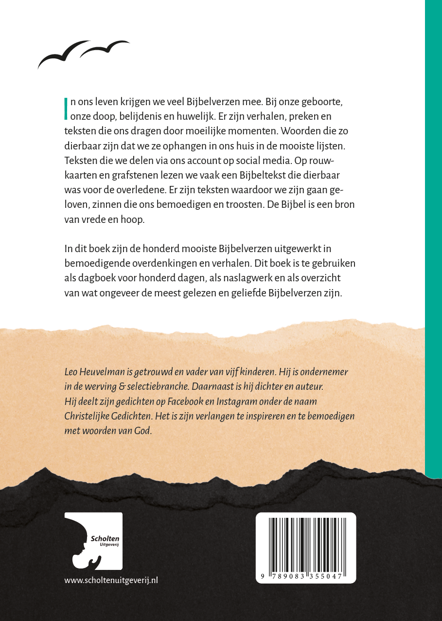 In dit boek zijn de honderd mooiste Bijbelverzen uitgewerkt in bemoedigende overdenkingen en verhalen. Dit boek is te gebruiken als dagboek voor honderd dagen, als naslagwerk en als overzicht van wat voor velen de meest gelezen en geliefde Bijbelverzen zijn.