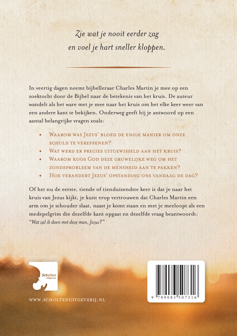 In veertig dagen neemt bijbelleraar Charles Martin je mee op een zoektocht door de Bijbel naar de betekenis van het kruis. De auteur wandelt als het ware met je mee naar het kruis om het elke keer weer van een andere kant te bekijken. Onderweg geeft hij je antwoord op een aantal belangrijke vragen zoals: