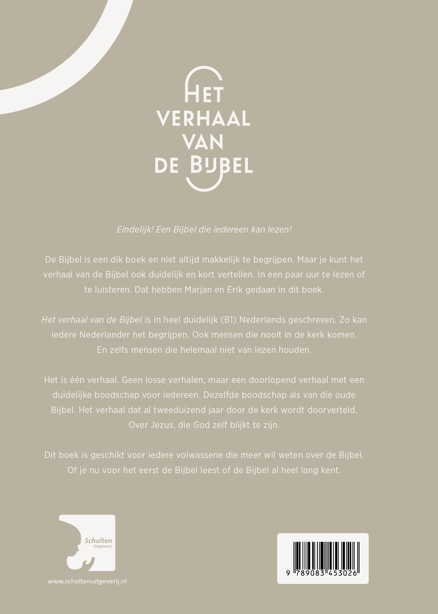 De Bijbel is een dik boek en niet altijd makkelijk te begrijpen. Maar je kunt het verhaal van de Bijbel ook duidelijk en kort vertellen. In een paar uur te lezen of te luisteren. Dat hebben Marjan en Erik gedaan in dit boek.