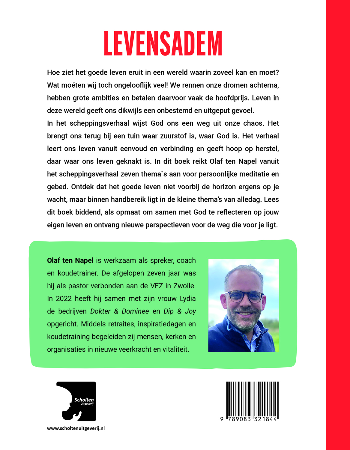In het scheppingsverhaal wijst God ons een weg uit onze chaos. Het brengt ons terug bij een tuin waar zuurstof is, waar God is. Het verhaal leert ons leven vanuit eenvoud en verbinding en geeft hoop op herstel, daar waar ons leven geknakt is. In dit boek reikt Olaf ten Napel vanuit het scheppingsverhaal zeven thema’s aan voor persoonlijke meditatie en gebed. Ontdek dat het goede leven niet voorbij de horizon ergens op je wacht, maar binnen handbereik ligt in de kleine thema’s van alledag. Lees dit boek biddend, als opmaat om samen met God te reflecteren op jouw eigen leven en ontvang nieuwe perspectieven voor de weg die voor je ligt.