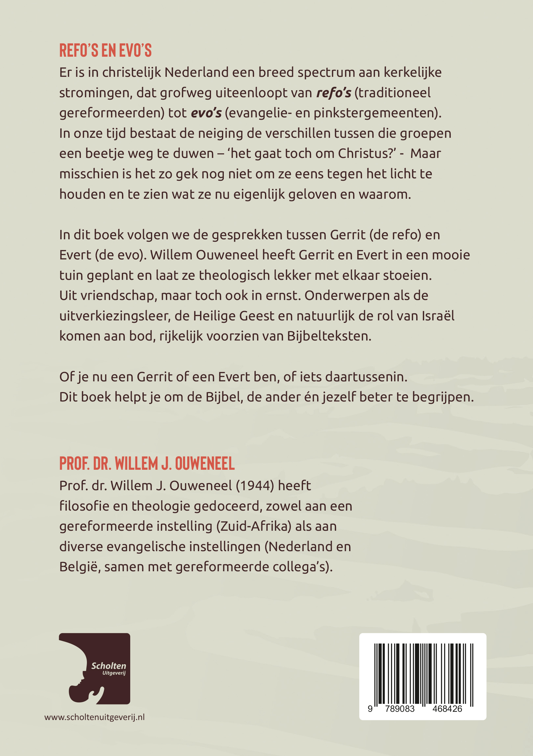 In dit boek volgen we de gesprekken tussen Gerrit (de refo) en Evert (de evo). Willem Ouweneel heeft Gerrit en Evert in een mooie tuin geplant en laat ze theologisch lekker met elkaar stoeien. Uit vriendschap, maar toch ook in ernst. Onderwerpen als de uitverkiezingsleer, de Heilige Geest en natuurlijk de rol van Israël komen aan bod, rijkelijk voorzien van Bijbelteksten.